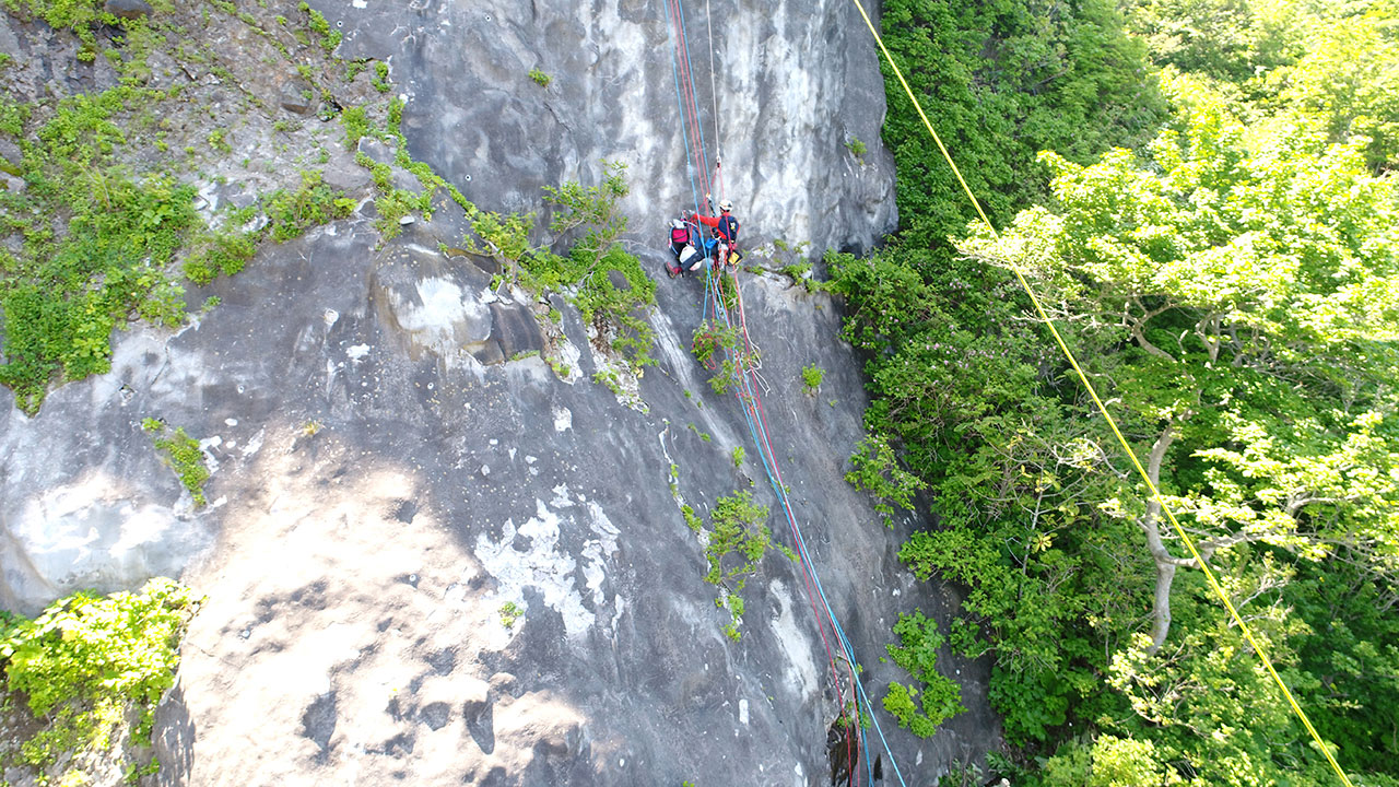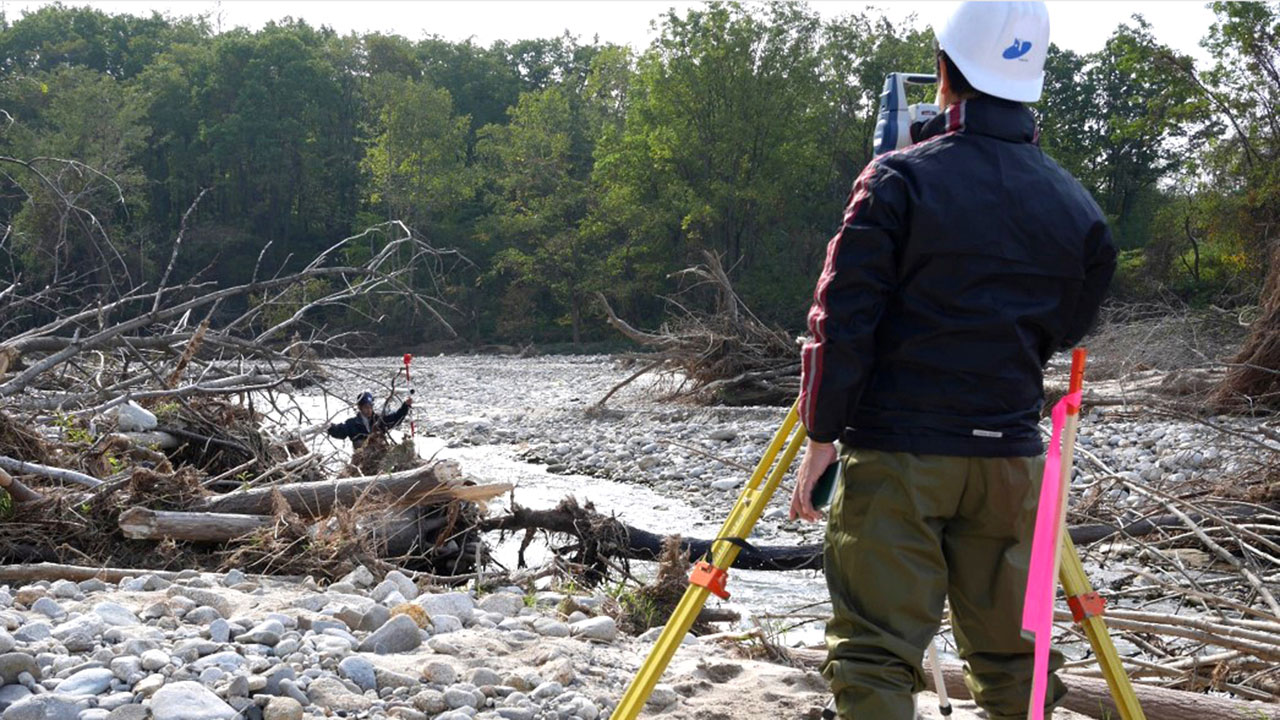 調査・測量・設計にはCIM(3次元モデル)やUAV(無人航空機)を導入しています。上空からはドローン、地上では3Dレーザースキャナーなどの最新機器を使って空間状況をデータベース化します。現地のフィールドワークにおいては作業時間が短縮でき、危険をともなう場所や計測しずらい道路も無人探索機なので、作業員の安全も確保されるといったメリットがあります。デジタル解析された膨大な3次元情報はデスクワークにおいてあらゆる角度から検討可能であり、設計前の調査、その後の具体的なプランの精度が格段に向上します。この他にも人工衛星の電波を利用したGNSS測量や音響測深機による水深調査など、陸海空のあらゆる事象に対して当社が誇るテクノロジーを適用しています。